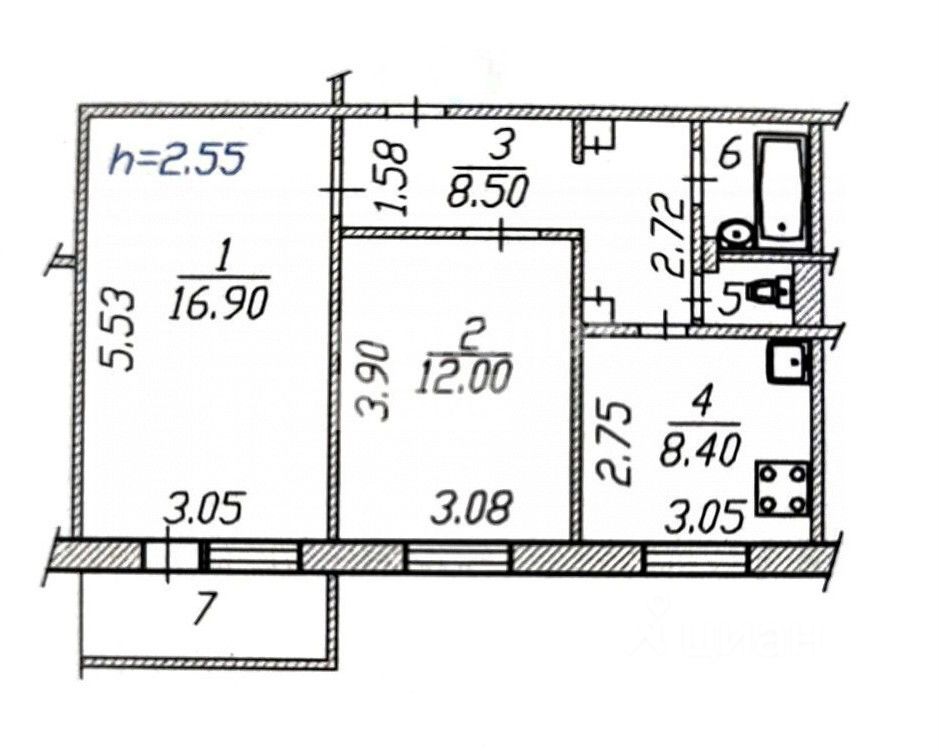 Общая площадь - 50,6 м2 в т.ч.: жилая - 28,9 м2 (спальня - 12, зал - 16,9) Кухня - 8,4 м2, прихожая - 8,5 м2, ванная и туалет - 2,6 и 1,0 м2, балкон - 0,8 м2, высота потолков - 2,55 м.