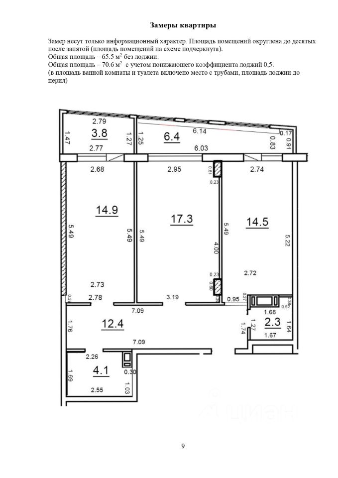 S общая=75.7 м2. Кухня: 14,5 м2, комнаты 17,3 и 14,9 м2., Лоджия витражная 3,8 м2 и 6,4 м2 из кухни и комнат застекленная. Гардеробная/бытовая комната. Санузел 4 м2 совмещенный. Этаж 15/18. Высота потолка 2,75 м