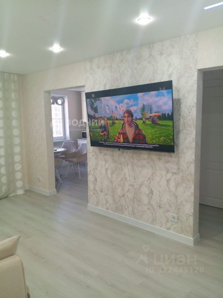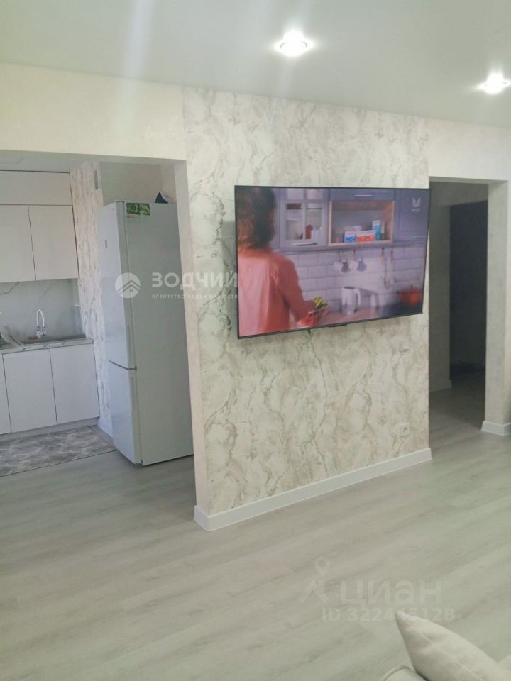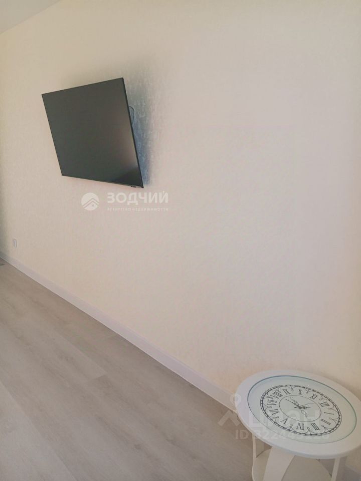 Гостиная совмещена с кухней. Есть просторный гардероб. В гостиной: диван, телевизор. На кухне обеденный стол со стульями.