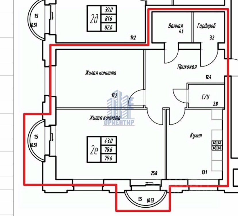 Общая квадратура 81.6 кв.м (с учётом двух балконов). Без балконов 78.6 общая площадь квартиры. Комнаты по 25.8 и 17.2 кв.м, кухня 13.1 м. Плюс два балкона с выходом из гостиной.