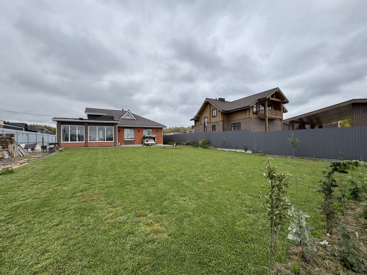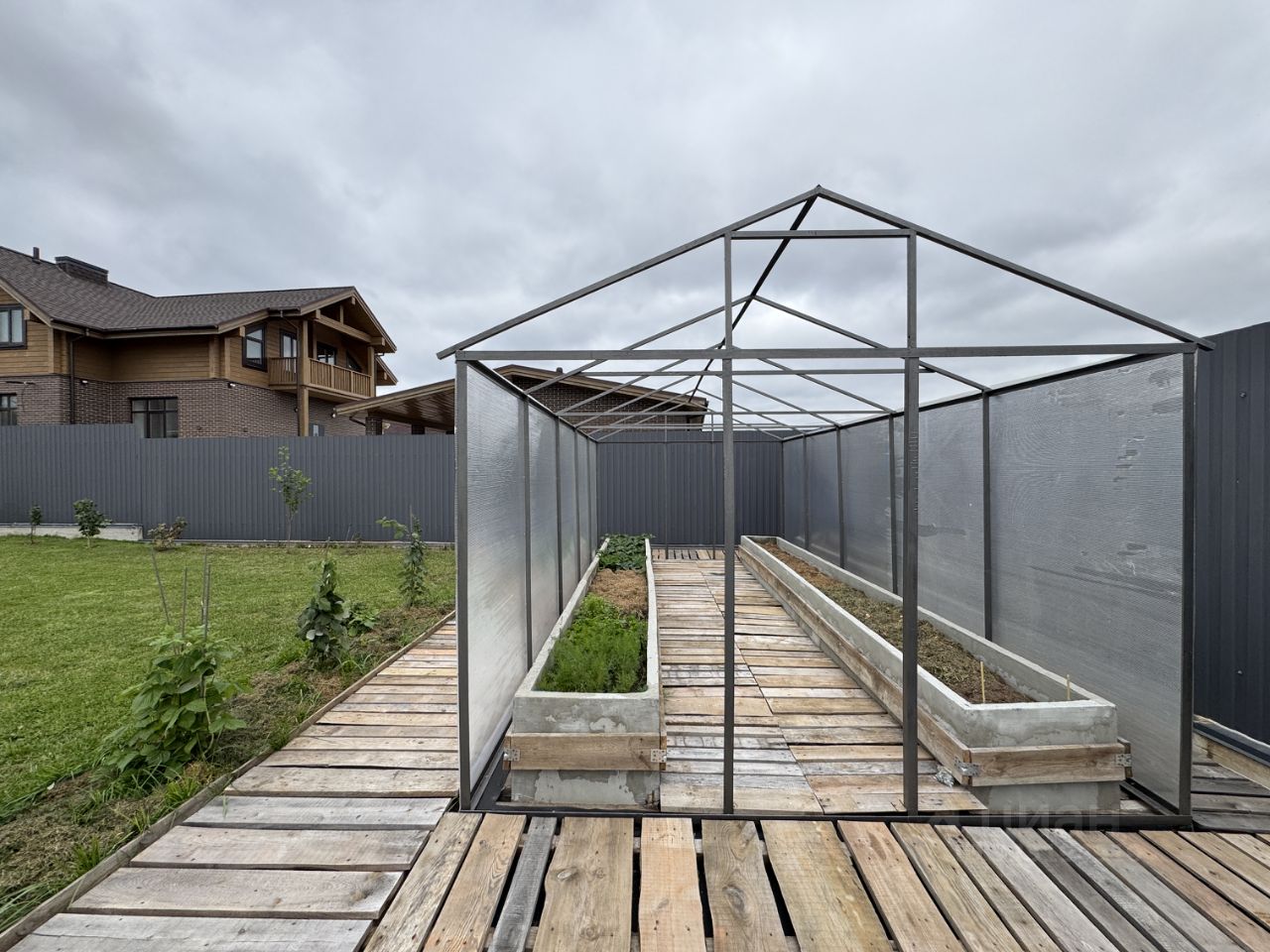 Ландшафтный дизайн на участке, теплица. Крытая парковка на 2 машины. Откатные ворота, брусчатка.