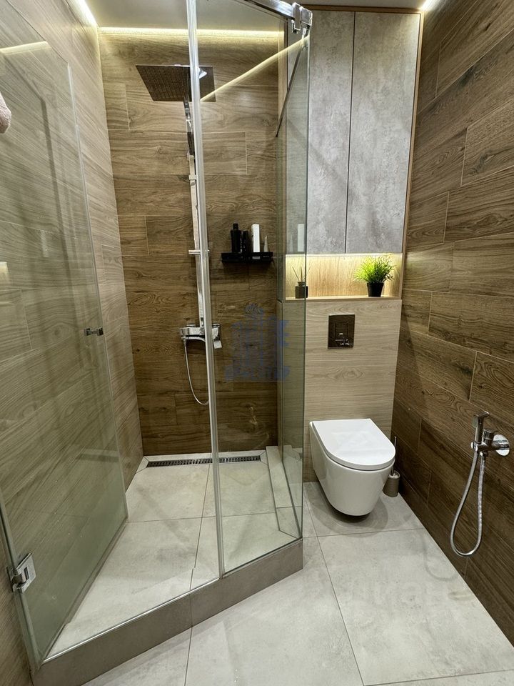 - Санузлы: Два санузла — один с душевой, другой с ванной. Также есть отдельная комната для стиральной и сушильной машин.