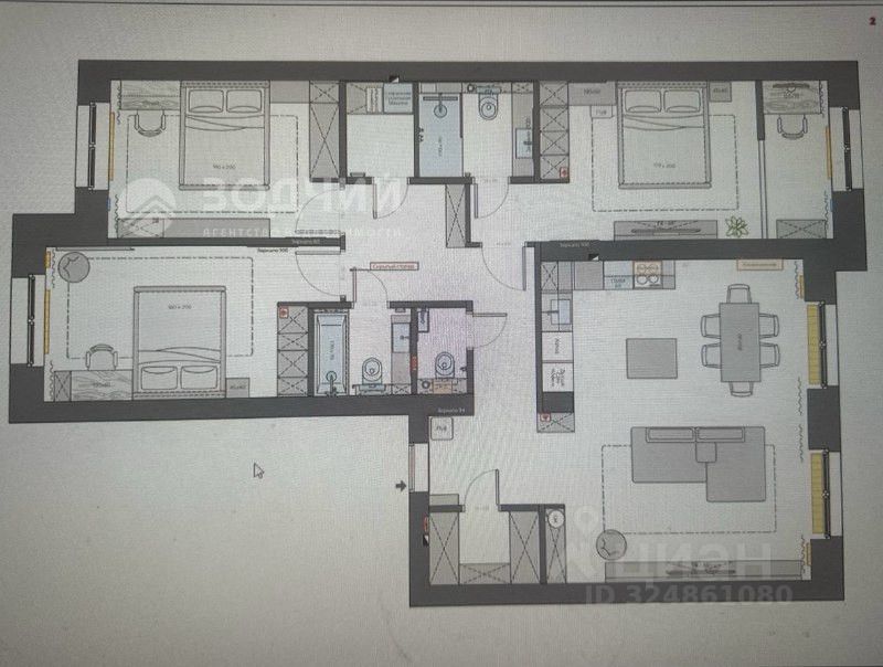 Особенности планировки: • Три Уютные Спальни: Квартира располагает тремя изолированными спальнями, каждая из которых спроектирована для максимального комфорта. В каждой спальне предусмотрено место для двуспальной кровати (160x200 см), рабочего стола и вместительного встроенного шкафа, обеспечивающего порядок и функциональность. Одна из спален также оснащена зоной для ТВ.