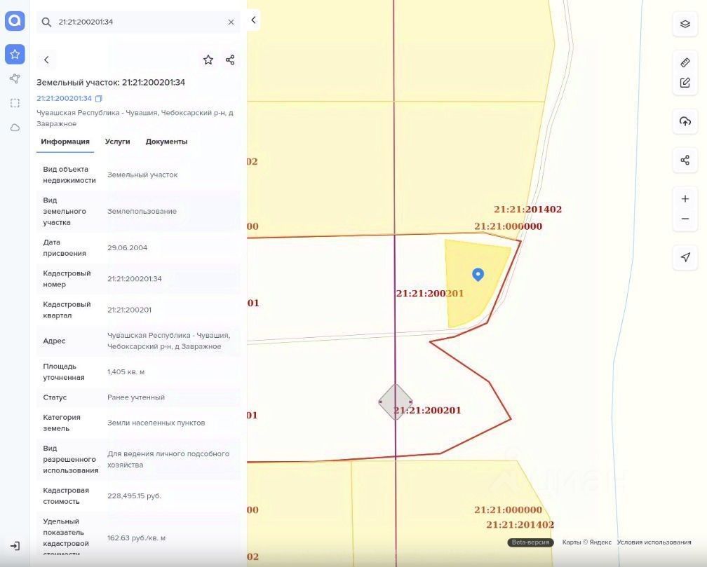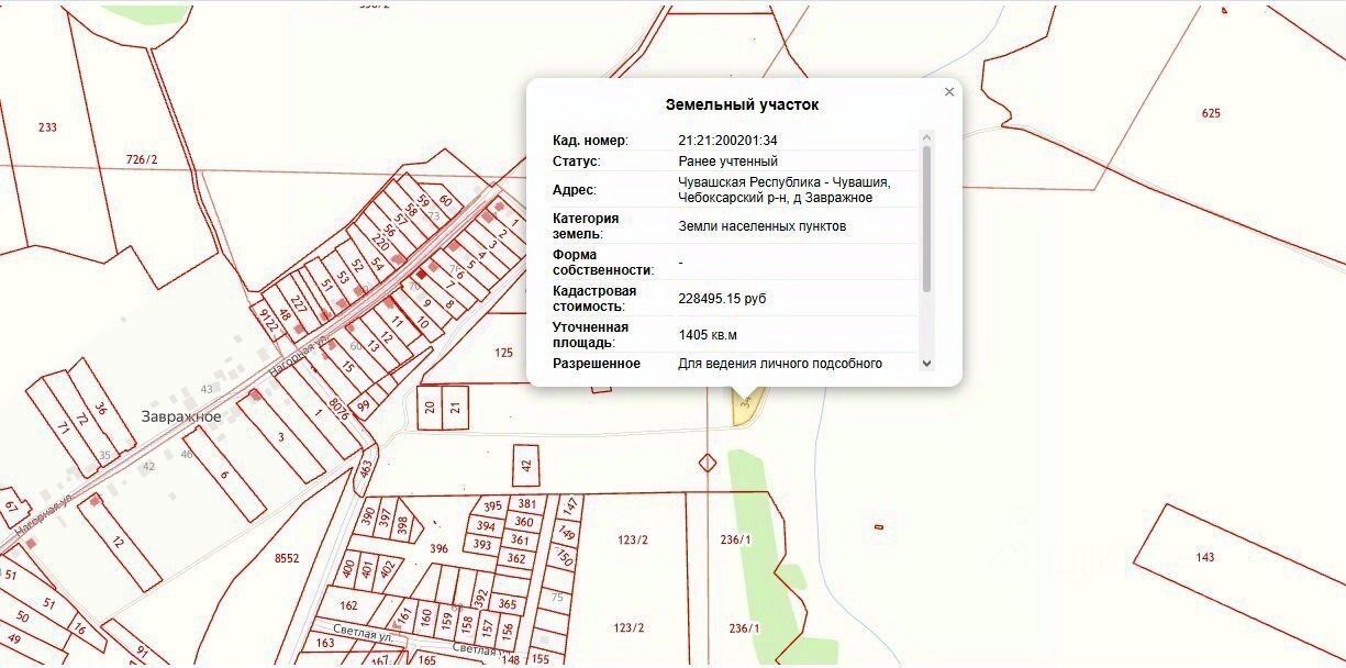Продаю земельный участок. Кадастровый номер: 21:21:200201:34. Вид разрешенного использования объекта недвижимости: Для ведения личного подсобного хозяйства. Площадь: 1405 +/- 26. Вид права: Собственность.